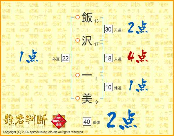 生活面を象徴する運勢です。外部から受ける影響力を表し、結婚運、家庭運や職場、環境への順応性を表します。総運から人運を引いた画数。姓や名が1文字の場合を除く。