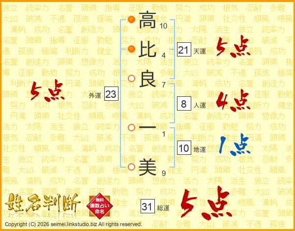 高(10画)比(4画)良(7画) 一(1画)美(9画)