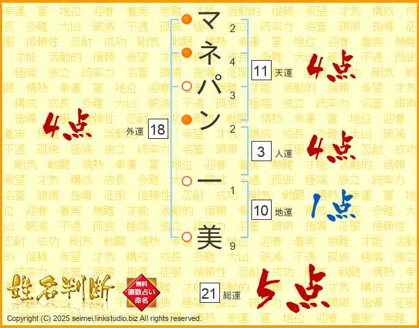 マ(2画)ネ(4画)パ(3画)ン(2画) 一(1画)美(9画)