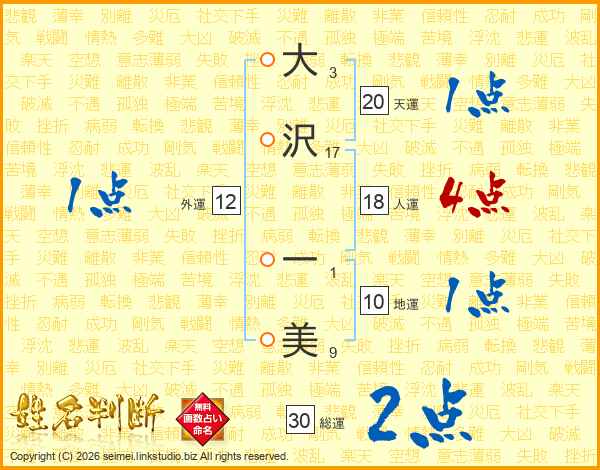 生活面を象徴する運勢です。外部から受ける影響力を表し、結婚運、家庭運や職場、環境への順応性を表します。総運から人運を引いた画数。姓や名が1文字の場合を除く。