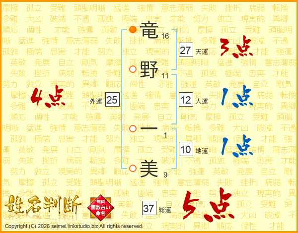 竜(16画)野(11画) 一(1画)美(9画)