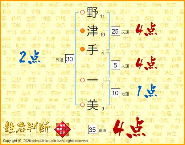 生活面を象徴する運勢です。外部から受ける影響力を表し、結婚運、家庭運や職場、環境への順応性を表します。総運から人運を引いた画数。姓や名が1文字の場合を除く。