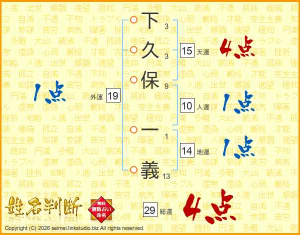 下(3画)久(3画)保(9画) 一(1画)義(13画)