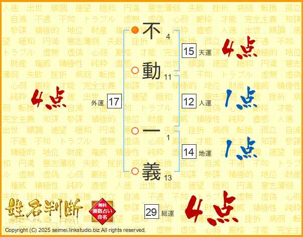 生活面を象徴する運勢です。外部から受ける影響力を表し、結婚運、家庭運や職場、環境への順応性を表します。総運から人運を引いた画数。姓や名が1文字の場合を除く。
