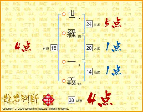 世羅一義さんの総運は38画の4点!