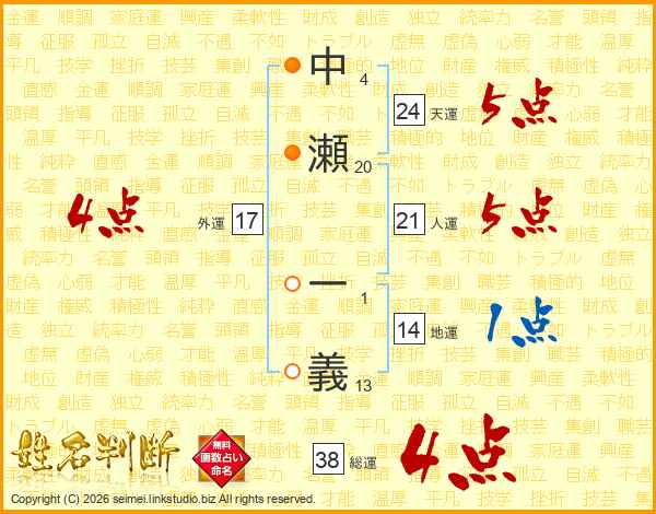 生活面を象徴する運勢です。外部から受ける影響力を表し、結婚運、家庭運や職場、環境への順応性を表します。総運から人運を引いた画数。姓や名が1文字の場合を除く。