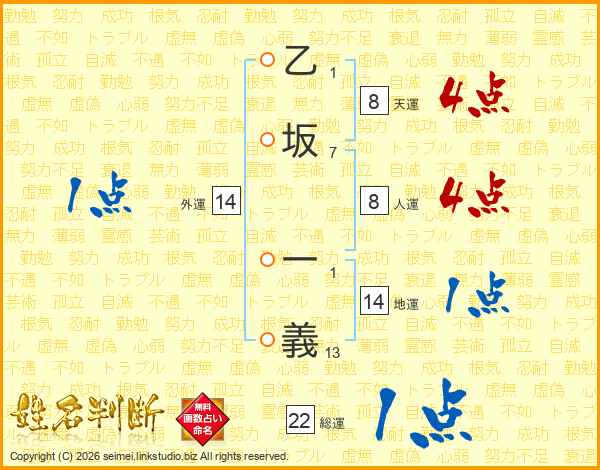 生活面を象徴する運勢です。外部から受ける影響力を表し、結婚運、家庭運や職場、環境への順応性を表します。総運から人運を引いた画数。姓や名が1文字の場合を除く。