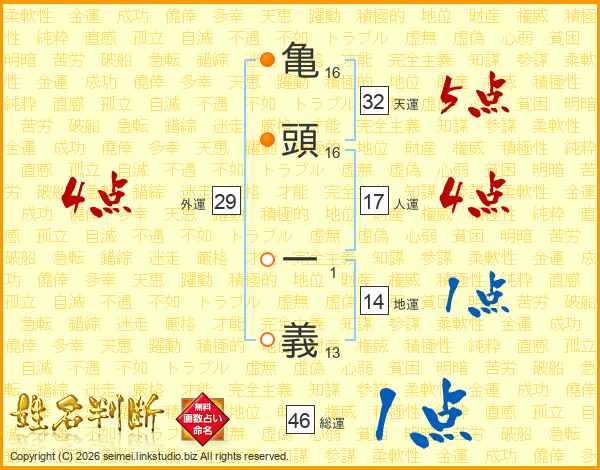 亀頭一義さんの総運は46画の1点!