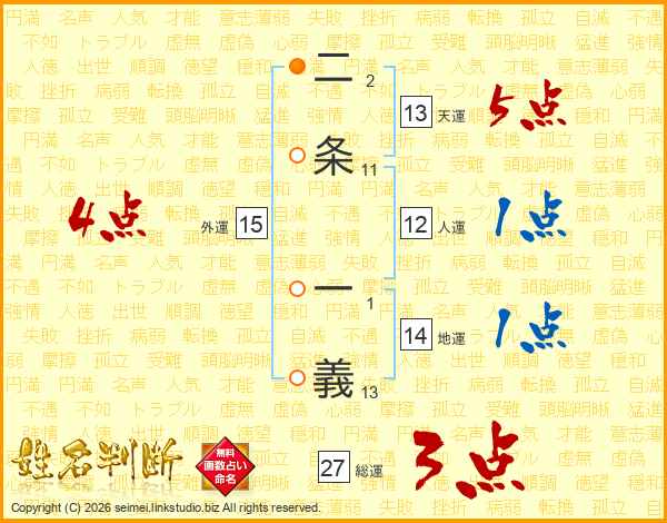 画数の奇数(○陽)と偶数(●陰)の配列で吉凶を占います。どちらかにかたよる名前は大凶名で避ける必要があります。画数の奇数偶数。