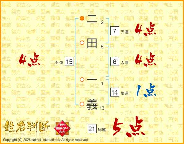 二田一義さんの総運は21画の5点!