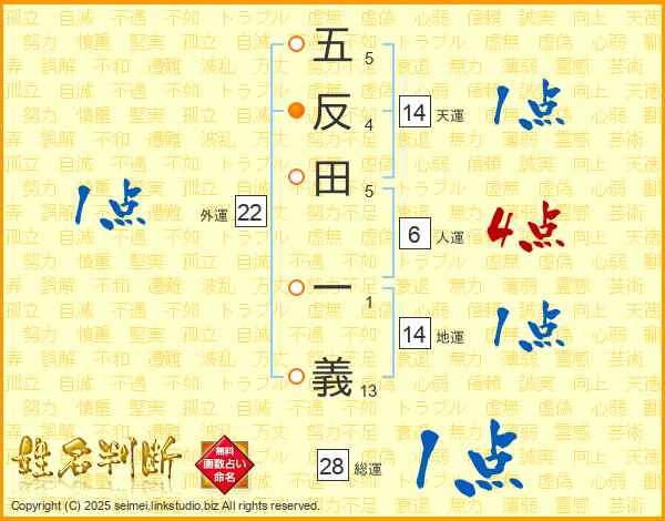 生活面を象徴する運勢です。外部から受ける影響力を表し、結婚運、家庭運や職場、環境への順応性を表します。総運から人運を引いた画数。姓や名が1文字の場合を除く。