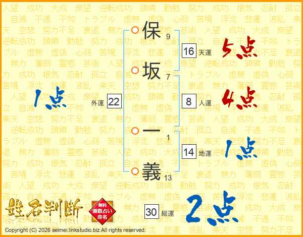 生活面を象徴する運勢です。外部から受ける影響力を表し、結婚運、家庭運や職場、環境への順応性を表します。総運から人運を引いた画数。姓や名が1文字の場合を除く。