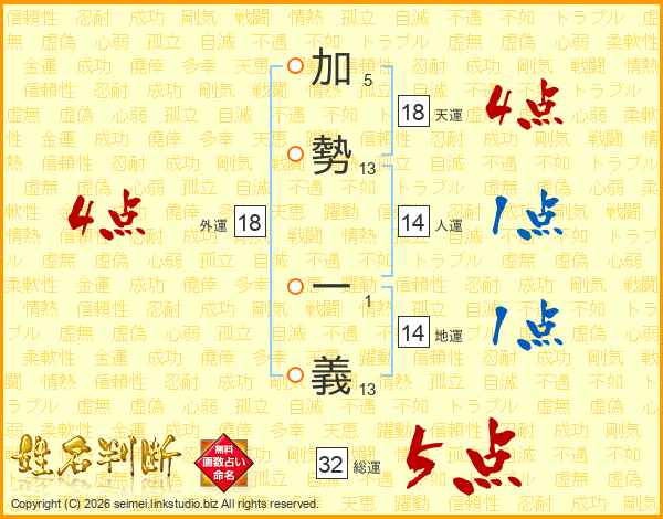 加勢一義さんの総運は32画の5点!