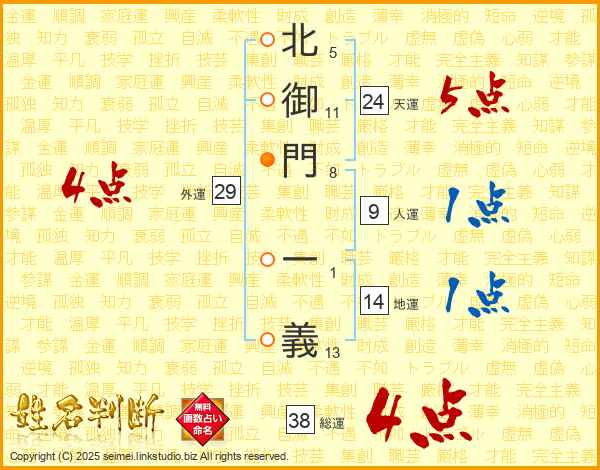 北(5画)御(11画)門(8画) 一(1画)義(13画)