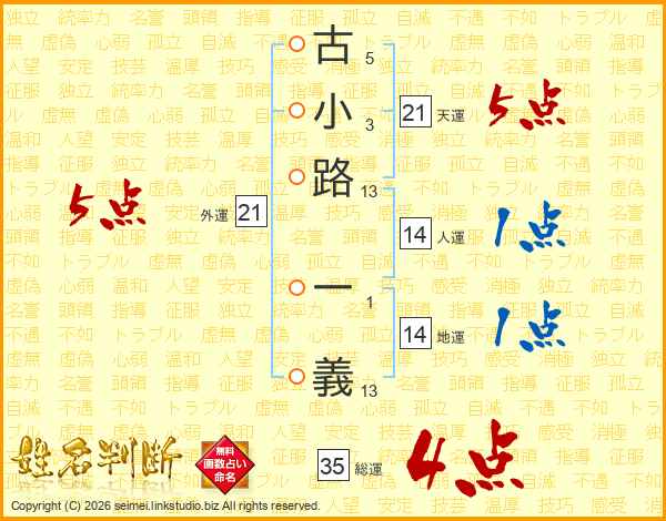 古(5画)小(3画)路(13画) 一(1画)義(13画)