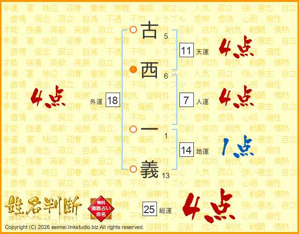 画数の奇数(○陽)と偶数(●陰)の配列で吉凶を占います。どちらかにかたよる名前は大凶名で避ける必要があります。画数の奇数偶数。