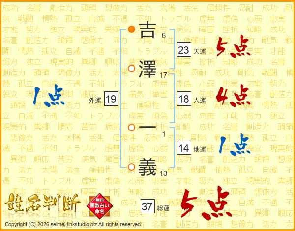生活面を象徴する運勢です。外部から受ける影響力を表し、結婚運、家庭運や職場、環境への順応性を表します。総運から人運を引いた画数。姓や名が1文字の場合を除く。