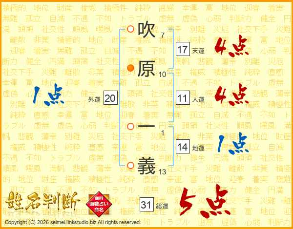 生活面を象徴する運勢です。外部から受ける影響力を表し、結婚運、家庭運や職場、環境への順応性を表します。総運から人運を引いた画数。姓や名が1文字の場合を除く。