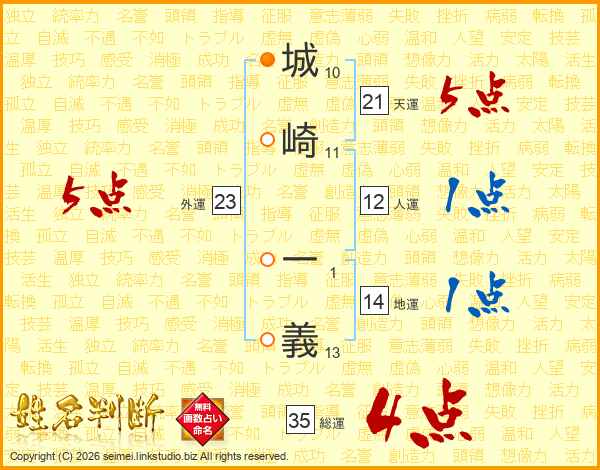 生活面を象徴する運勢です。外部から受ける影響力を表し、結婚運、家庭運や職場、環境への順応性を表します。総運から人運を引いた画数。姓や名が1文字の場合を除く。