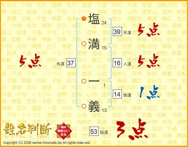 塩満一義さんの天運は39画の5点!