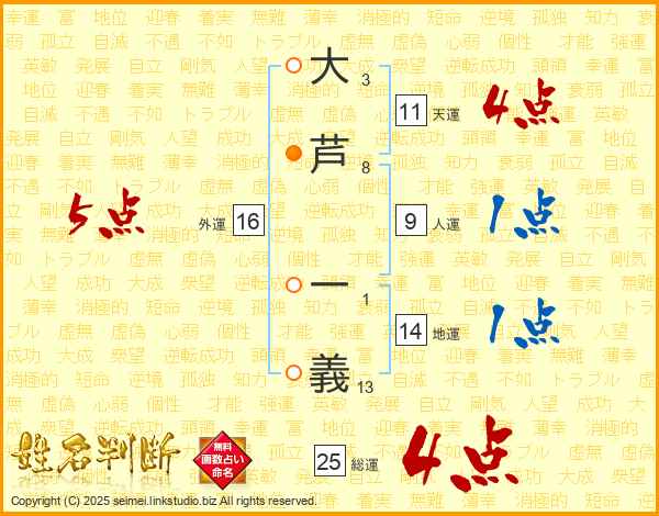 生活面を象徴する運勢です。外部から受ける影響力を表し、結婚運、家庭運や職場、環境への順応性を表します。総運から人運を引いた画数。姓や名が1文字の場合を除く。