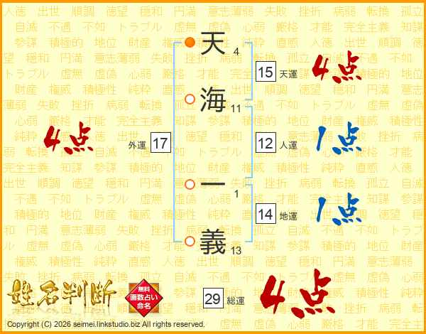天海一義さんの総運は29画の4点!