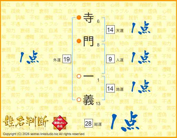 生活面を象徴する運勢です。外部から受ける影響力を表し、結婚運、家庭運や職場、環境への順応性を表します。総運から人運を引いた画数。姓や名が1文字の場合を除く。