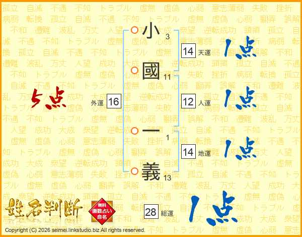 生活面を象徴する運勢です。外部から受ける影響力を表し、結婚運、家庭運や職場、環境への順応性を表します。総運から人運を引いた画数。姓や名が1文字の場合を除く。
