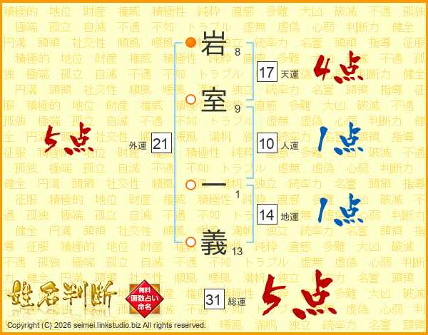 岩(8画)室(9画) 一(1画)義(13画)