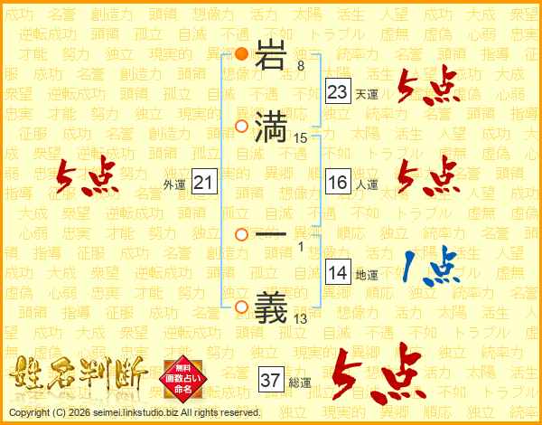 あなたの人生を表す1番重要な運勢です。生涯を通じて影響する総合運となり、主に50歳以降の晩年期に影響を及ぼします。苗字と名前の合計画数。