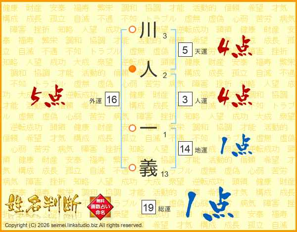 生活面を象徴する運勢です。外部から受ける影響力を表し、結婚運、家庭運や職場、環境への順応性を表します。総運から人運を引いた画数。姓や名が1文字の場合を除く。