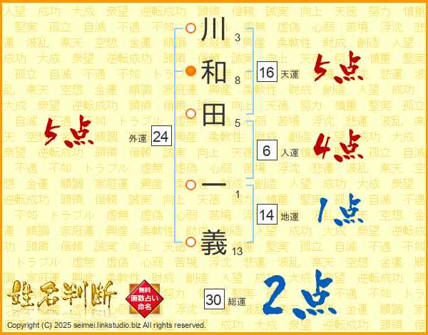 川(3画)和(8画)田(5画) 一(1画)義(13画)