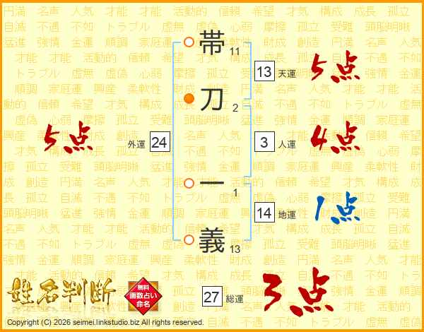 生活面を象徴する運勢です。外部から受ける影響力を表し、結婚運、家庭運や職場、環境への順応性を表します。総運から人運を引いた画数。姓や名が1文字の場合を除く。