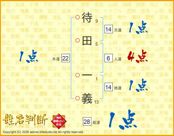 生活面を象徴する運勢です。外部から受ける影響力を表し、結婚運、家庭運や職場、環境への順応性を表します。総運から人運を引いた画数。姓や名が1文字の場合を除く。