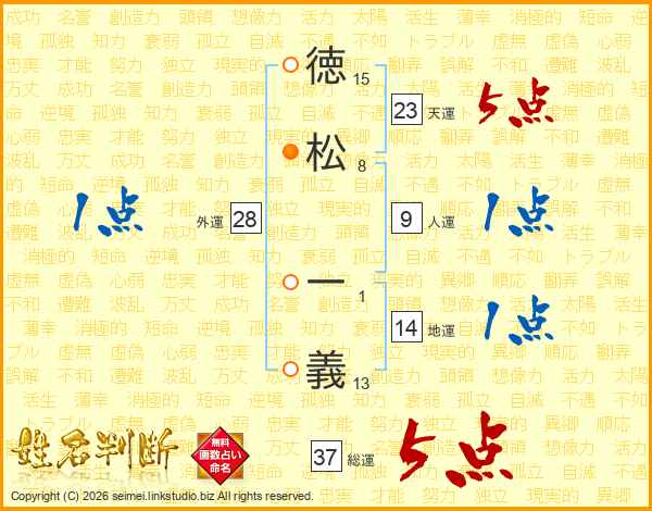 生活面を象徴する運勢です。外部から受ける影響力を表し、結婚運、家庭運や職場、環境への順応性を表します。総運から人運を引いた画数。姓や名が1文字の場合を除く。