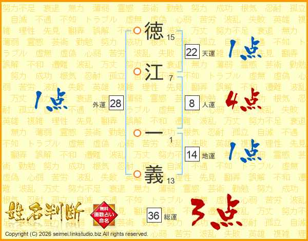 生活面を象徴する運勢です。外部から受ける影響力を表し、結婚運、家庭運や職場、環境への順応性を表します。総運から人運を引いた画数。姓や名が1文字の場合を除く。