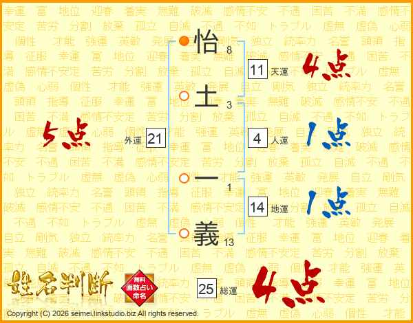 生活面を象徴する運勢です。外部から受ける影響力を表し、結婚運、家庭運や職場、環境への順応性を表します。総運から人運を引いた画数。姓や名が1文字の場合を除く。