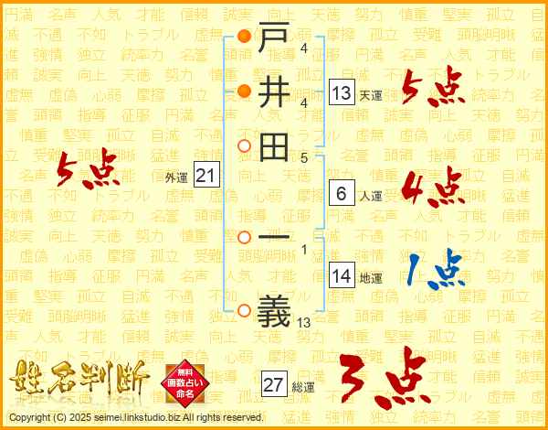 戸(4画)井(4画)田(5画) 一(1画)義(13画)