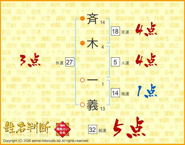 生活面を象徴する運勢です。外部から受ける影響力を表し、結婚運、家庭運や職場、環境への順応性を表します。総運から人運を引いた画数。姓や名が1文字の場合を除く。