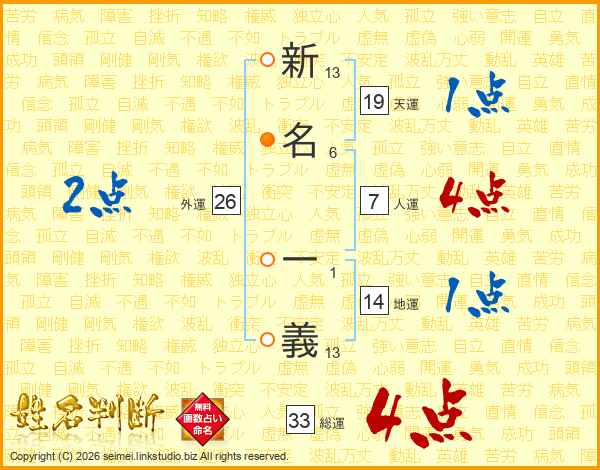 生活面を象徴する運勢です。外部から受ける影響力を表し、結婚運、家庭運や職場、環境への順応性を表します。総運から人運を引いた画数。姓や名が1文字の場合を除く。