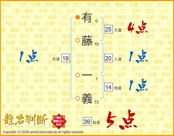 生活面を象徴する運勢です。外部から受ける影響力を表し、結婚運、家庭運や職場、環境への順応性を表します。総運から人運を引いた画数。姓や名が1文字の場合を除く。