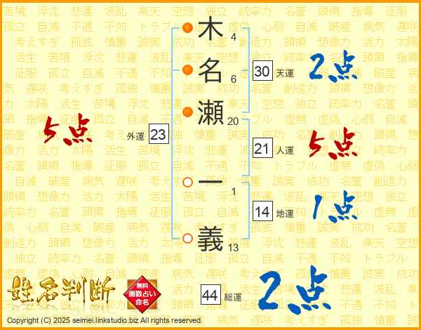 木(4画)名(6画)瀬(20画) 一(1画)義(13画)