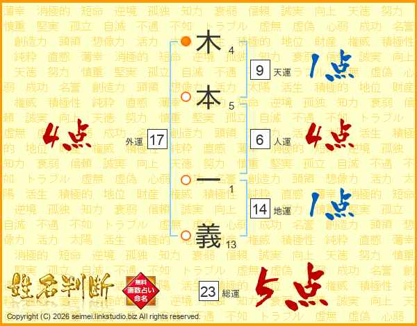 画数の奇数(○陽)と偶数(●陰)の配列で吉凶を占います。どちらかにかたよる名前は大凶名で避ける必要があります。画数の奇数偶数。