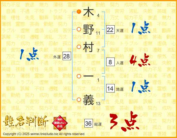 木(4画)野(11画)村(7画) 一(1画)義(13画)