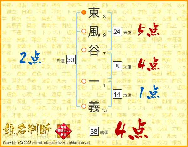 東(8画)風(9画)谷(7画) 一(1画)義(13画)