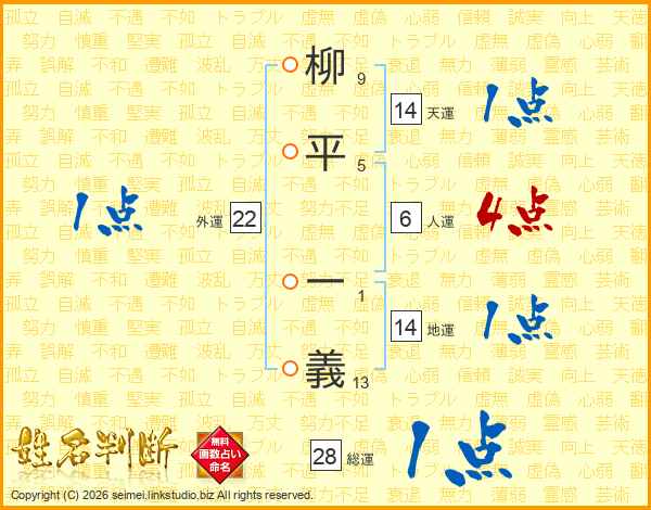 生活面を象徴する運勢です。外部から受ける影響力を表し、結婚運、家庭運や職場、環境への順応性を表します。総運から人運を引いた画数。姓や名が1文字の場合を除く。