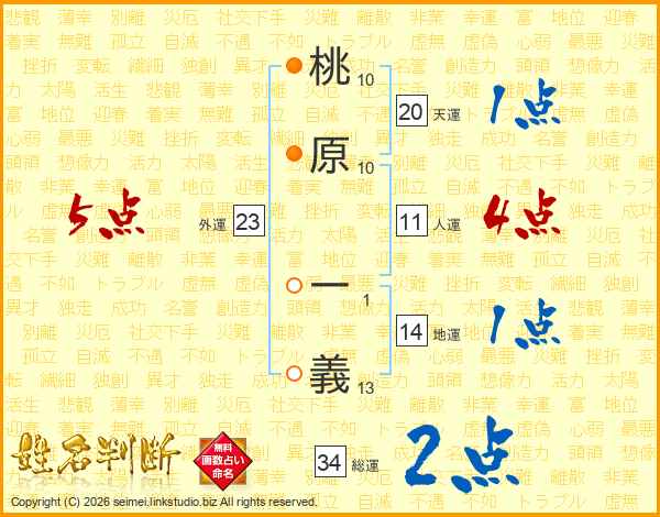 あなたの人生を表す1番重要な運勢です。生涯を通じて影響する総合運となり、主に50歳以降の晩年期に影響を及ぼします。苗字と名前の合計画数。