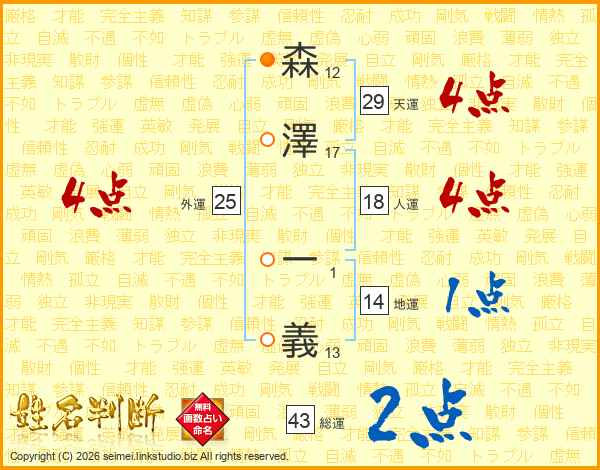 あなたの人生を表す1番重要な運勢です。生涯を通じて影響する総合運となり、主に50歳以降の晩年期に影響を及ぼします。苗字と名前の合計画数。