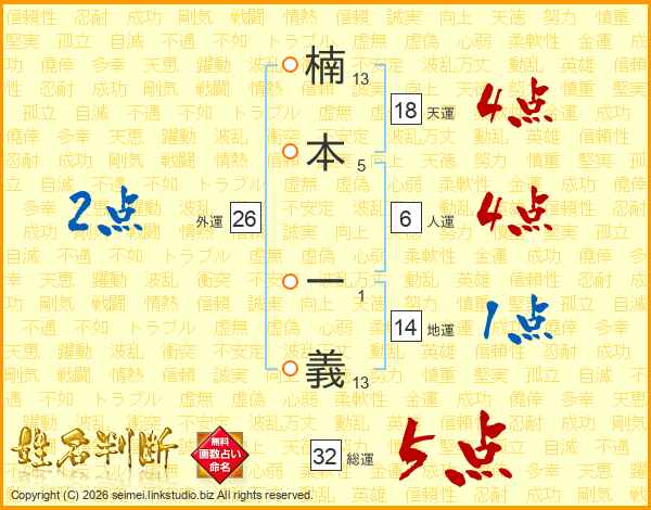 あなたの人生を表す1番重要な運勢です。生涯を通じて影響する総合運となり、主に50歳以降の晩年期に影響を及ぼします。苗字と名前の合計画数。