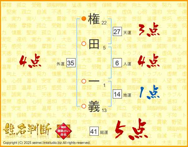 生活面を象徴する運勢です。外部から受ける影響力を表し、結婚運、家庭運や職場、環境への順応性を表します。総運から人運を引いた画数。姓や名が1文字の場合を除く。